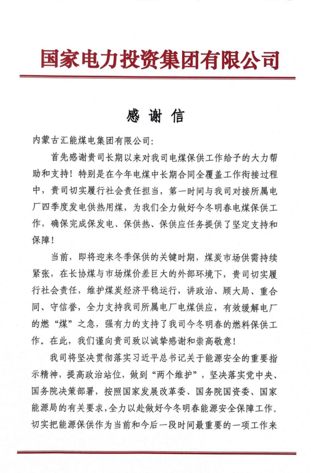 國家電力投資集團有限公司給匯能集團的感謝信