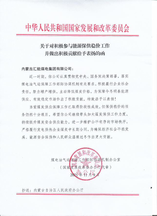 國家發(fā)改委關(guān)于對積極參與能源保供穩(wěn)價(jià)工作并做出積極貢獻(xiàn)給予表揚(yáng)的函