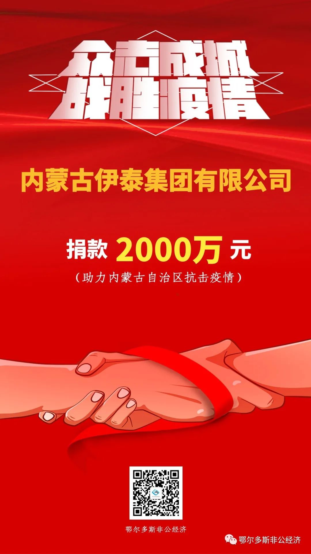 疫情發生后,我市多家民營企業聞令而動,通過捐資捐物全力配合支援呼和浩特市、包頭市打贏疫情防控阻擊戰,匯聚起眾志成城、萬眾一心的強大力量。其中,匯能集團捐款3000萬元、伊泰集團捐款2000萬元、滿世集團捐款1500萬元、烏蘭集團捐款1000萬元、蒙泰集團捐款1000萬元。民營企業以實際行動書寫熱愛祖國、奉獻社會、建設家鄉的家國情懷,彰顯了鄂爾多斯市本土民營企業的社會責任與擔當,為堅決打贏疫情防控阻擊戰貢獻了力量。