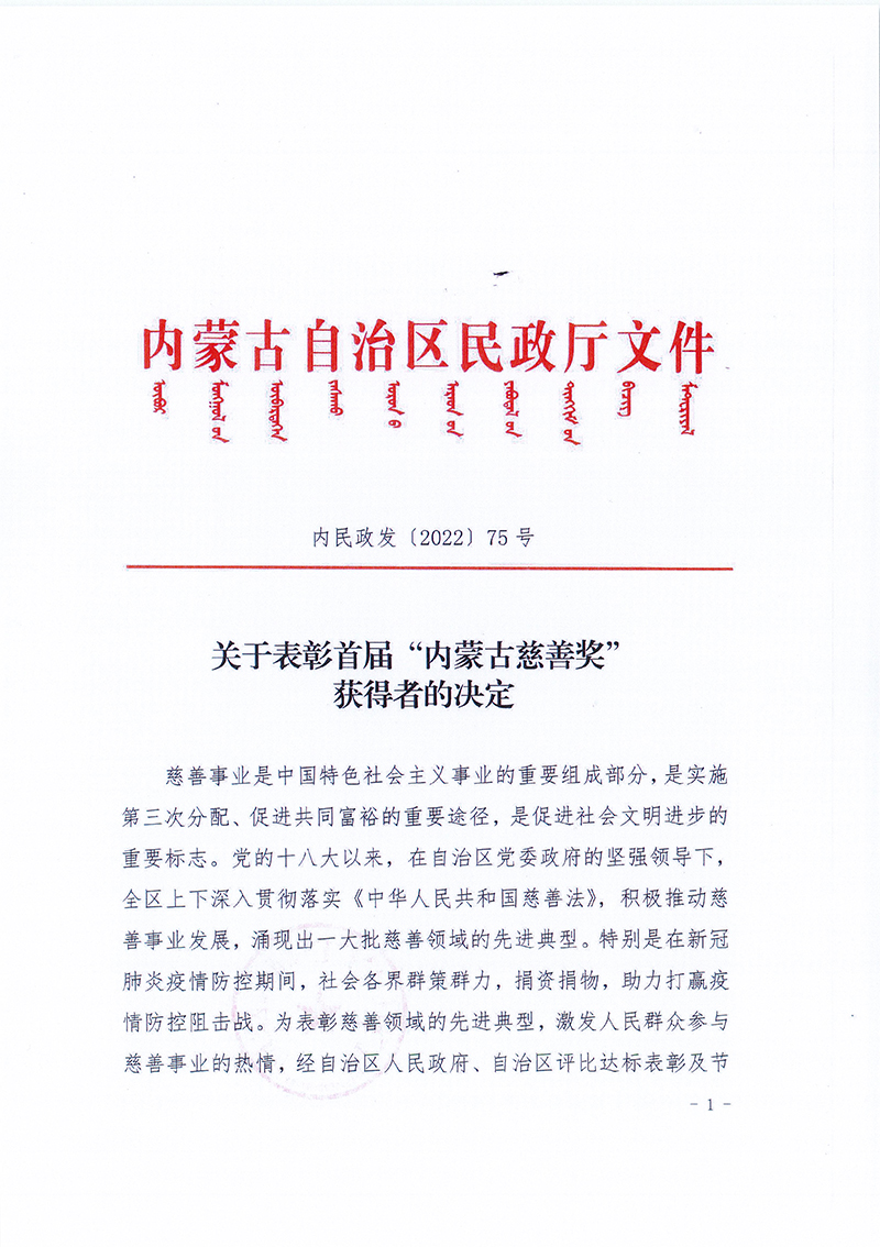 關于表彰首屆“內蒙古慈善獎”獲得者的決定