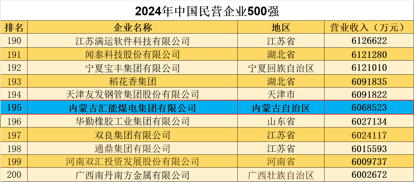 10 月 12 日,全國工商聯(lián)發(fā)布 2024 中國民營企業(yè) 500 強(qiáng)報(bào)告并公布榜單。匯能控股集團(tuán)有限公司(原內(nèi)蒙古匯能煤電集團(tuán)有限公司)位列榜單195位,較2023年的240位前進(jìn)44位。